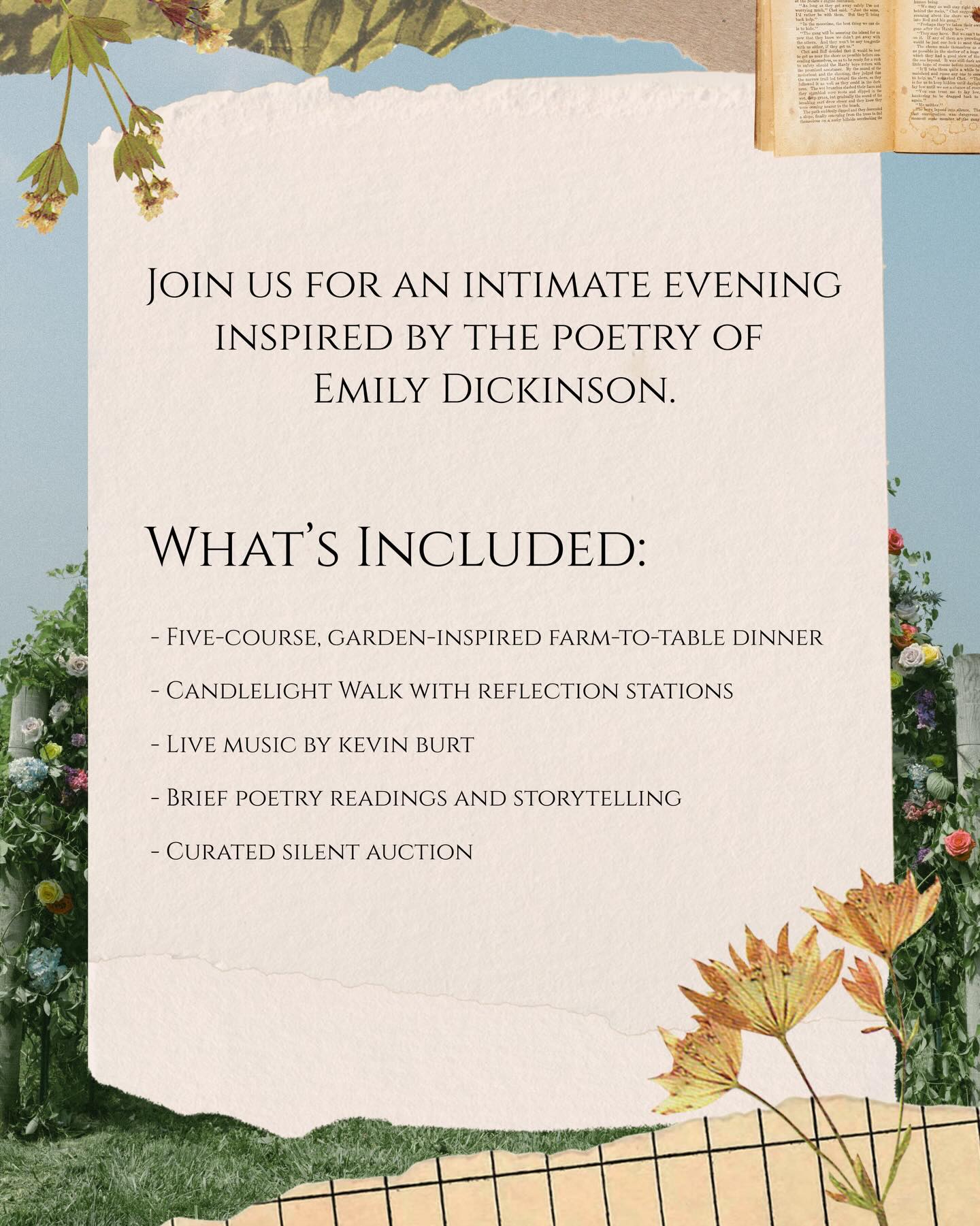 Join us on March 8 for a farm-to-table dinner at Walker Homestead! Held on the evening of Daylight Saving Time—when light quite literally returns—A Light Exists in Spring is inspired by the poetry of Emily Dickinson and the quiet power of hope before growth begins.